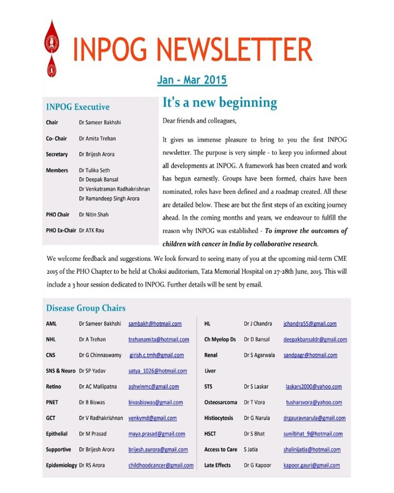 To earnestly push forward the above-mentioned agenda and energize the effort, the 4th INPOG Business meeting was organized by Drs. ATK Rau (Chair), Amita Trehan (Hon. Secretary) and Santanu Sen (LOC Chair) on 19 July 2014 under the aegis of the PHO Chapter in the Kokilaben Dhirubai Ambani Hospital in Mumbai. Combined with a scientific discussion on collaborative research and the 1st ever Mid-term CME of the Chapter, the meeting aggressively sought to re-establish the failing fledgling effort of collaborative research in pediatric oncology by involving as many of the stake holders as possible. 27 members from all over the country attended the conclave and are listed below: Dr. Anupam Sachdeva (Delhi), Dr. Bharat Agarwal (Mumbai), Dr. Purna Kurkure (Mumbai), Dr. L Appaji (Bangalore), Dr. P Kusumakumari (Trivandrum), Dr. Jagdish Chandra (Delhi), Dr. Mamta Manglani (Mumbai), Dr. Praveen Sobti (Ludhiana), Dr. ATK Rau (Bangalore), Dr. Madhusmita Sengupta (Kolkata), Dr. Gaurav Narula (Mumbai), Dr. Satya Yadav (Delhi), Dr. Shailesh Kanvinde (Pune), Dr. Tulika Seth (Delhi), Dr. Sameer Bakhshi (Delhi), Dr. Gauri Kapoor (Delhi), Dr. Amita Trehan (Chandigarh), Dr. Amita Mahajan (Delhi), Dr. Leni Mathews (Vellore), Dr. Deepa Trivedi (Ahmedabad), Dr. Siddharth Laskar (Mumbai), Dr. Sangeeta Mudaliar (Mumbai), Dr. Archana Swami (Mumbai), Dr Manas Kalra (Delhi), Dr. Anand Prakash (Bangalore) and Dr. Vibha Bafna (Pune). At this meeting, it was resolved to appoint new leads for this initiative and implement all pending decisions taken in regard to formally establishing this research wing of the PHO Chapter. Accordingly, Dr. Anupam Sachdeva, Chair and Dr. Purna Kurkure, Co - chair stepped down from their respective positions and were replaced by a new executive committee duly elected later during PHOCON 2014 in Chennai, for a tenure of 3 years from 2015 to 2018 which had the following as office bearers: